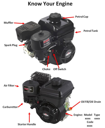 This engine has a paper air cleaner, a plastic tank, metal float type carburettor and over head valves also known as OHV.